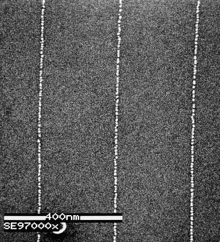image shows very fine lines defined by ~5 nm diameter islands of Au. The