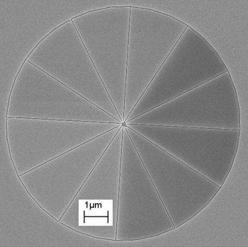 As is shown here, only some of the wedge structures will charge, since others will have enough of an electrical connection to discharge. In general, sputter coated samples are less likely to display this effect, however, this particular sample was sputter coated, which indicates it had very good undercutting. These linewidths are ~80 nm and the resist is ~200 nm thick. The periodic "ripples" in the lines at 3, 6, 9, and 12 o'clock are an imaging artifact that appear when the pixel size of the image is approximately the same as the linewidths. Also see the general SEM Optimization Guide and the SEM Lithography Setup Guide. |
