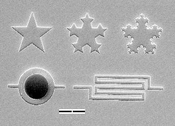 Such charging is more common when the resist is coated using a directional source such as an evaporation system, while sputtered metal is more likely to coat the edges and prevent the charging. Similarly, evaporated metal is more likely to produce a clean lift-off, while sputtered metal is more likely to produce a poor lift-off. While charging can produce unusual looking images, the charging is a good sign, since it indicates a good undercut in the resist side wall. Note that this pattern is also slightly underexposed, as can be seen by the few remnants of resist (bright spots) in the bottom of the exposed part of the circular structure. Also, the serpentine structure in the lower right displays a common bright/dark edge artifact seen when straight lines are almost parallel to the scan axis in a digitized image. The same effect is seen more dramatically in the middle picture on the USA map page. A non-charging view of the pattern shown above can be seen here. Note that this other image is fully exposed and the higher resolution of the digitized image eliminates the artifacts on the serpentine structure. |
