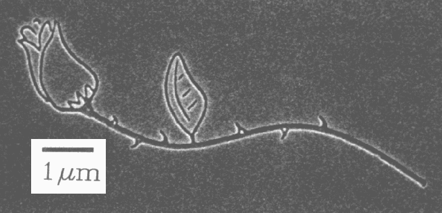 This image shows the flexibility of the pattern writing possible with NPGS. It is interesting to note that when this pattern was first written in 1989, the competitor's most powerful system which cost over 5 times as much as NPGS could not even write a 45 degree line, much less an arbitrary slope. This is just one example of how NPGS pioneered the field of high performance commercial SEM lithography for research applications.