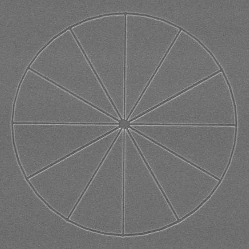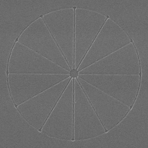 Even though the writing field size only changed by about 5%, a very dramatic improvement in the writing quality was obtained once the proper magnification was selected. Wheels written with lower line doses at this magnification had linewidths down to ~30 nm, while the 1700x patterns were barely observable at the lower doses. |