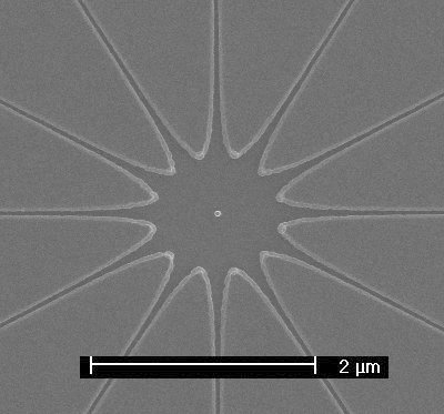 Note that the lower kV makes the proximity effect much more pronounced. Specifically, while the wheel that was written at 30 kV has a center exposed area that is only ~200 nm wide where the spokes meet and the spokes do not broaden noticeably where they join together, the wheel shown here that was written at 10 kV has a center area that is over a micron across and the spokes broaden a very significant amount as they approach the center. Also, at 10 kV, a center dot is seen where the dose was 12 times higher because all 12 spokes started at the same location and at the lower kV of the beam, the dose at this dot was enough to turn the PMMA negative. Also see "Negative PMMA". In general, the smallest features with the smallest effects from proximity doses will be obtained at the highest available kV of the microscope, see "Wheel #1". |